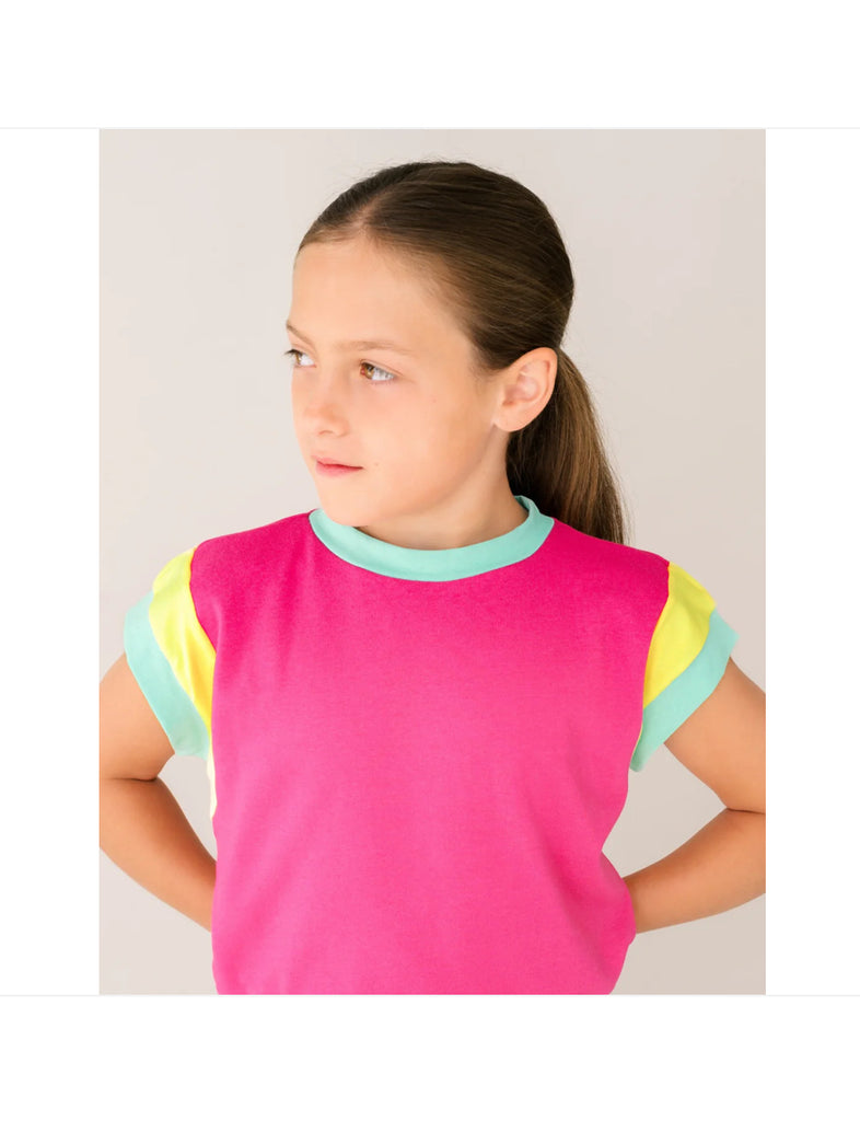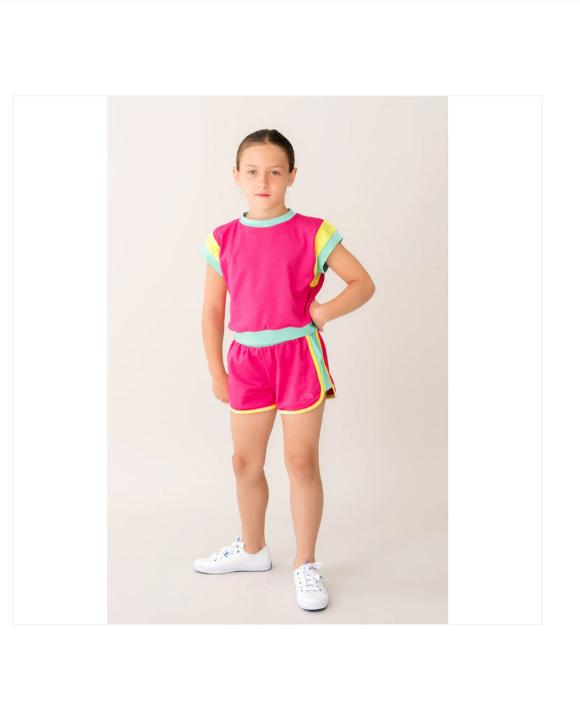The Ellie Everyday Set is a vibrant new style designed for play and comfort. Featuring a bold mix of Power Pink, Totally Turquoise, and Sunshine Yellow, this knit short set is both fun and sporty, making it the perfect go-to outfit for active days and everyday adventures.
