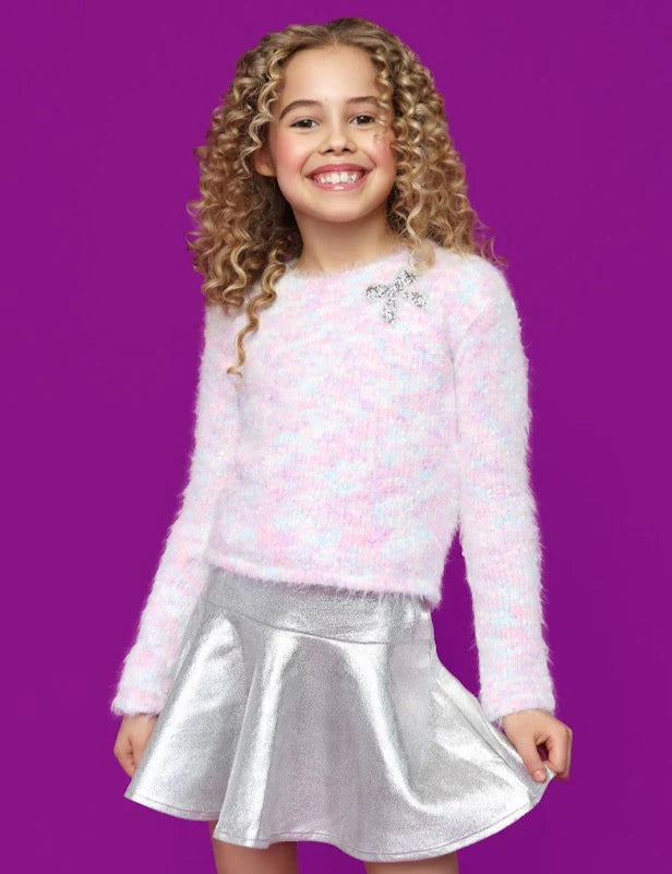 Add instant sparkle to her wardrobe with this silver metallic flared skirt. Featuring a high-waisted fit and soft, flowy silhouette, it’s perfect for parties, holidays, and special outings. The comfortable elastic waistband ensures a great fit, while the shimmering finish makes it a statement piece she’ll love twirling in. Pairs beautifully with sweaters, tees, or dressy tops for endless outfit options. Sizing is true.