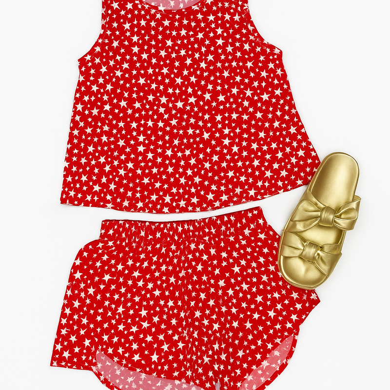 These Star Spangled Shorts feature convenient mid-front pockets and a comfortable elastic waistband for all-day wear. The versatile design coordinates perfectly with the matching top for a complete, cohesive look. Crafted with attention to detail, these shorts provide both functionality and style for your wardrobe.