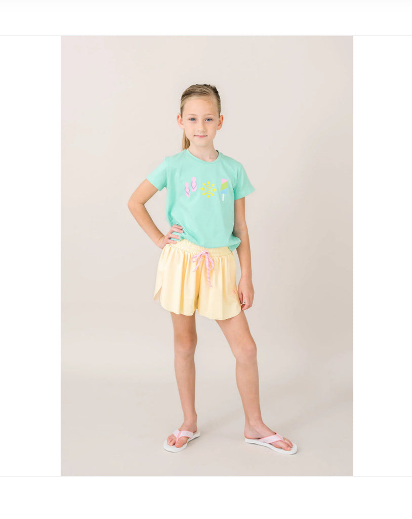 The Tatum Short is a new fly-away style in Sunshine Yellow, designed for a fun and sporty look. Featuring Flamingo Pink Stripe biker shorts and a matching tie, this set offers both style and comfort, making it perfect for active days and playtime adventures.