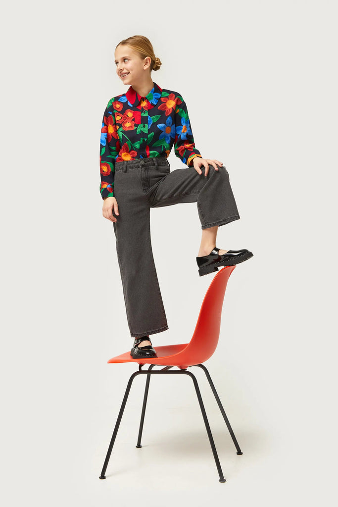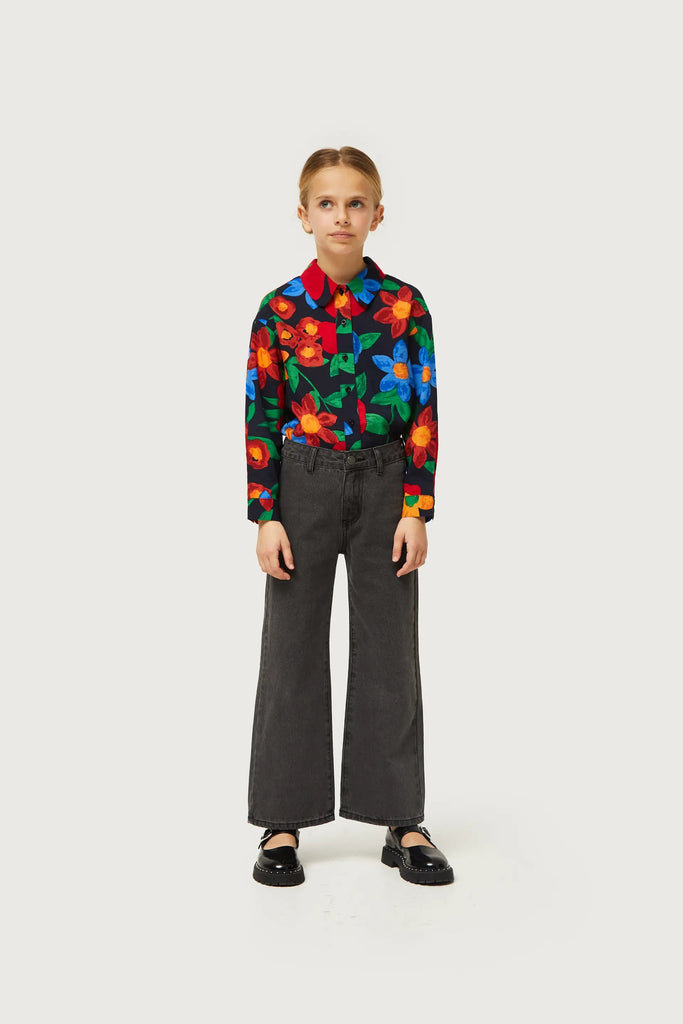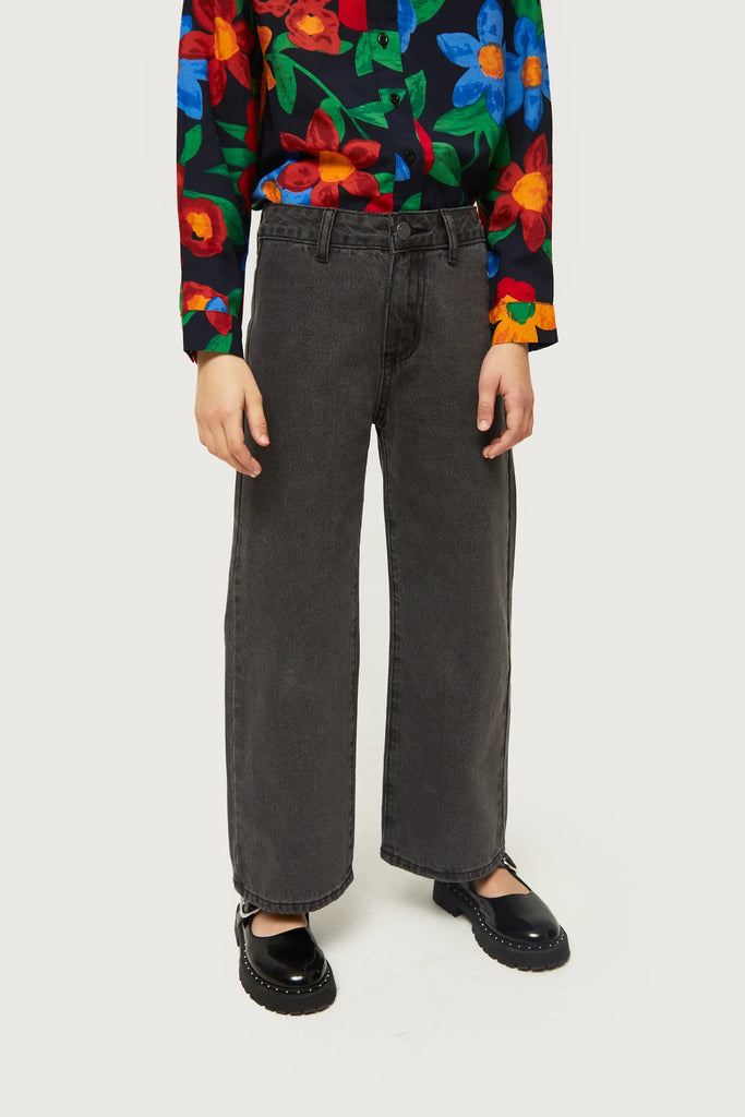 Washed black girls' jeans. With a high-rise waist and straight leg. Button and zipper closure. Belt loops. The model is 137 cm tall and wears size 8.