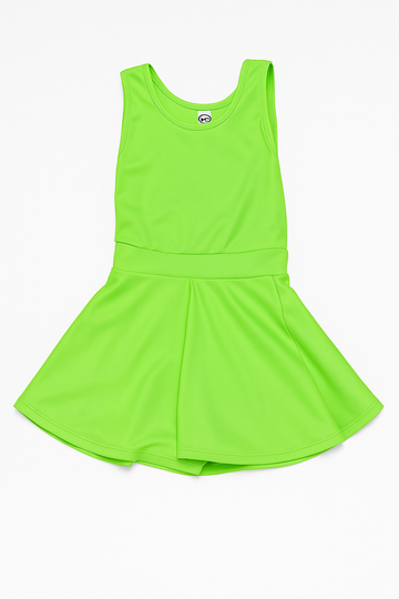 This Neon Lime Yoga Dress Romper features a banded neckline and sleeve openings, along with an elasticized waist for a comfortable fit. With self fabric shorts hidden under the skirt, this romper is perfect for any yoga session. Stay stylish and comfortable all in one with this must-have piece.