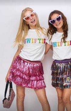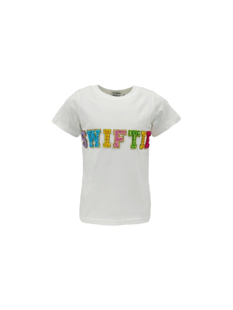 - This chic white tee is adorned with the word "SWIFTIE" in a spectrum of sparkling crystals, perfect for showing off their fun and vibrant personality.