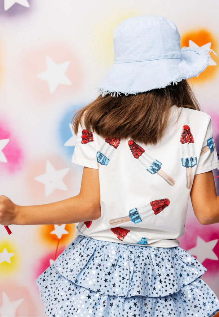 Sparkle through summer with this festive tee! Perfect for your girl/tween! This sparkle sequin shirt will add a touch of playfulness to any outfit! This girls tee has the perfect amount of stretch and is adorned with sequin bomb pops on front and back.