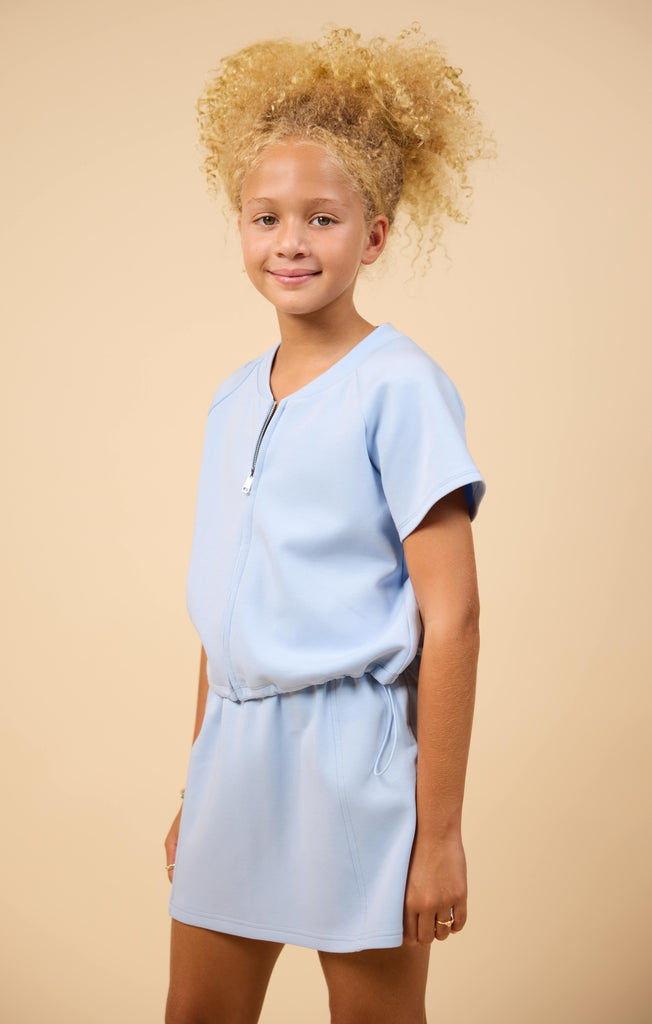 This soft, knit jacket has a crop boxy profile with a zipper up the front. It features short sleeves and an elasticized cording with toggles for a snug fit at the waist.