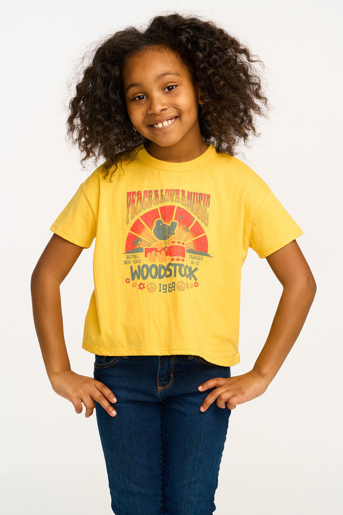 Style up your daughter with this Woodstock Peach & Love & Music Tee! With a golden yellow color and a vintage jersey-style fabric, this one-of-a-kind tee lets her express her unique style.