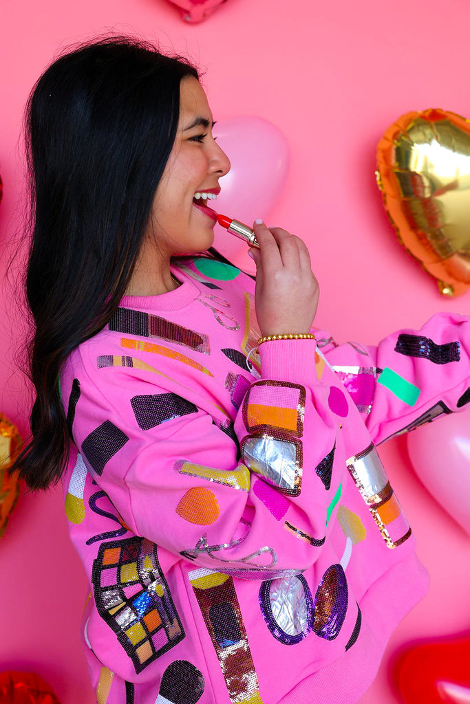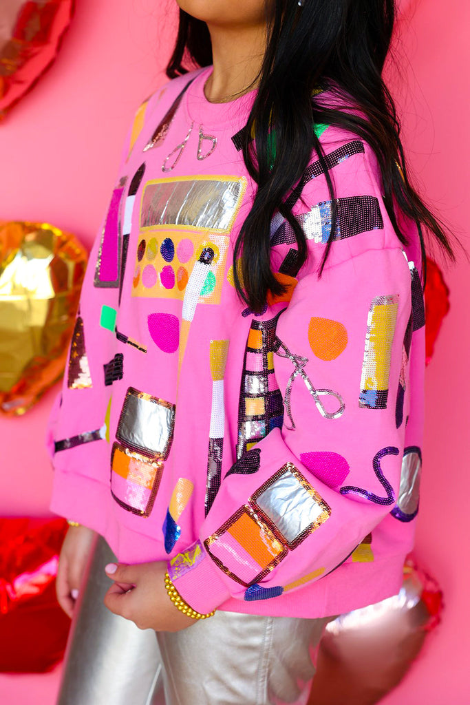 Rule the makeup game in this Kids Hot Pink Makeup Sweatshirt! With eye-catching sequin makeup pieces and a hot pink color, you'll be styling wherever you go. This sweatshirt is perfect for a playful and glamorous look that will turn heads and make a statement.