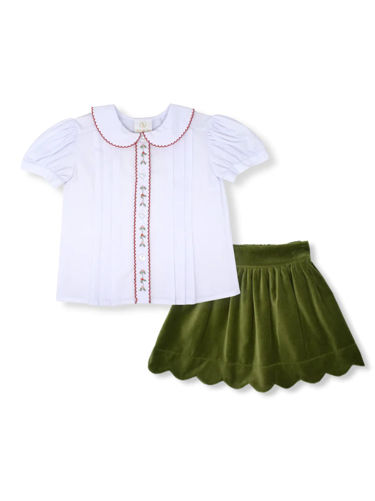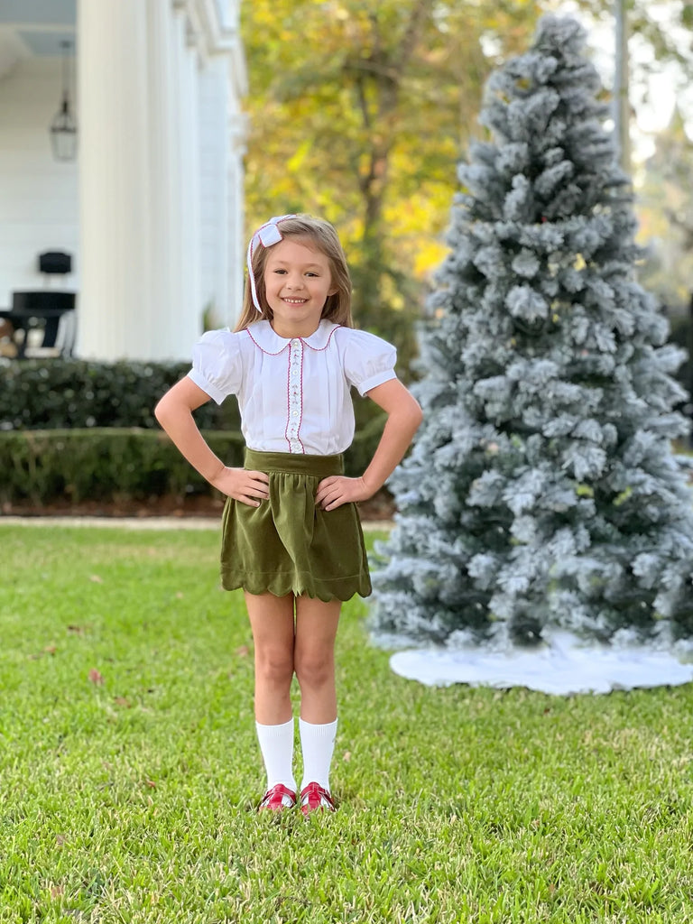 A classic big girl look, perfect for Christmas! The green velvet skirt pairs perfectly with this custom embroidered batiste blouse to have her ready for all the fun and fancy events over the holidays.