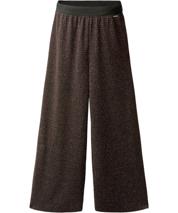 Multicolored pleated pants with glitter thread. The pants have a loose fit with wide legs and an elastic waist.