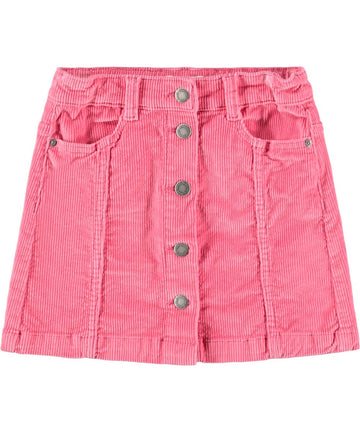 Pink corduroy skirt with buttons for fastening. The skirt reaches mid-thigh and has a waist with belt loops and front pockets. The beautiful cut includes detailed stitching that runs from the pockets down.