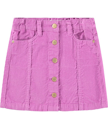 Purple corduroy skirt with buttons for fastening. The skirt reaches mid-thigh and has a waist with belt loops and front pockets. The beautiful cut includes detailed stitching that runs from the pockets down.