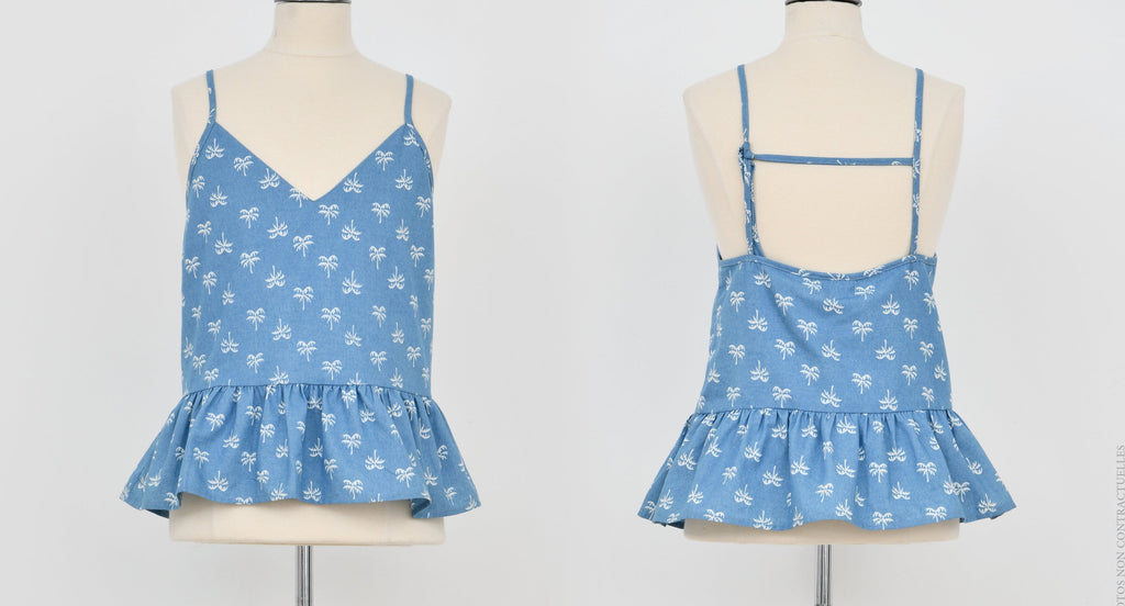 Top with thin straps and wide ruffled band for a peplum silhouette, palm tree pattern on blue background.