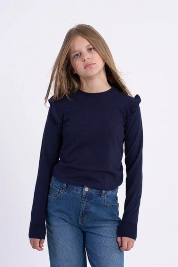 This navy girls' sweater combines cozy warmth with charming details. Its fine knit and slim fit gently hug her frame, while the semi-high neckline adds a touch of elegance. Long sleeves end in wide, tightened cuffs for a playful twist, and ruffled bands on the shoulders bring extra fun flair to every move. Crafted from a soft blend of viscose, polyester, and polyamide, it’s perfect for day-to-day adventures with a stylish edge.