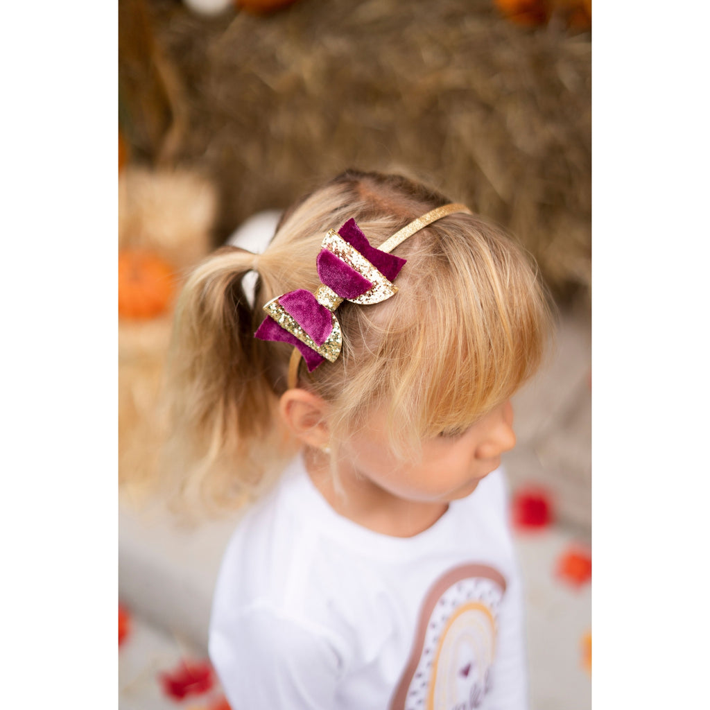 The Berry Bow Kids Headband is the perfect kids hair accessory for celebrating Thanksgiving! This Sweet Wink kids headband has a velvet bow accented with a gold glitter bow. The inside of the headband is lined with gold satin ribbon for comfort and the outside of the band is decorated with gold glitter (don't worry - the glitter doesn't shed!). Color: Plumberry & Gold Size: One Size Material: Velvet & Glitter Pair this kids headband with the Thankful Rainbow Shirt and Berry Tutu for a complete head-to-toe Thanksgiving outfit!