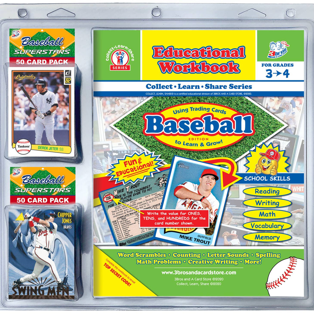 Baseball Card collecting REIMAGINED, with our Collect, Learn, Share Series! Educational workbook/ Baseball Card Combo Pack for Grades 3-4. •Utilizes our Starter Kit Cards to incorporate 22 educational standards! •Reinforces skills for school: Math, Reading, Writing, and Language Arts! •100 Baseball Cards included in each kit • #1 product for starting collectors