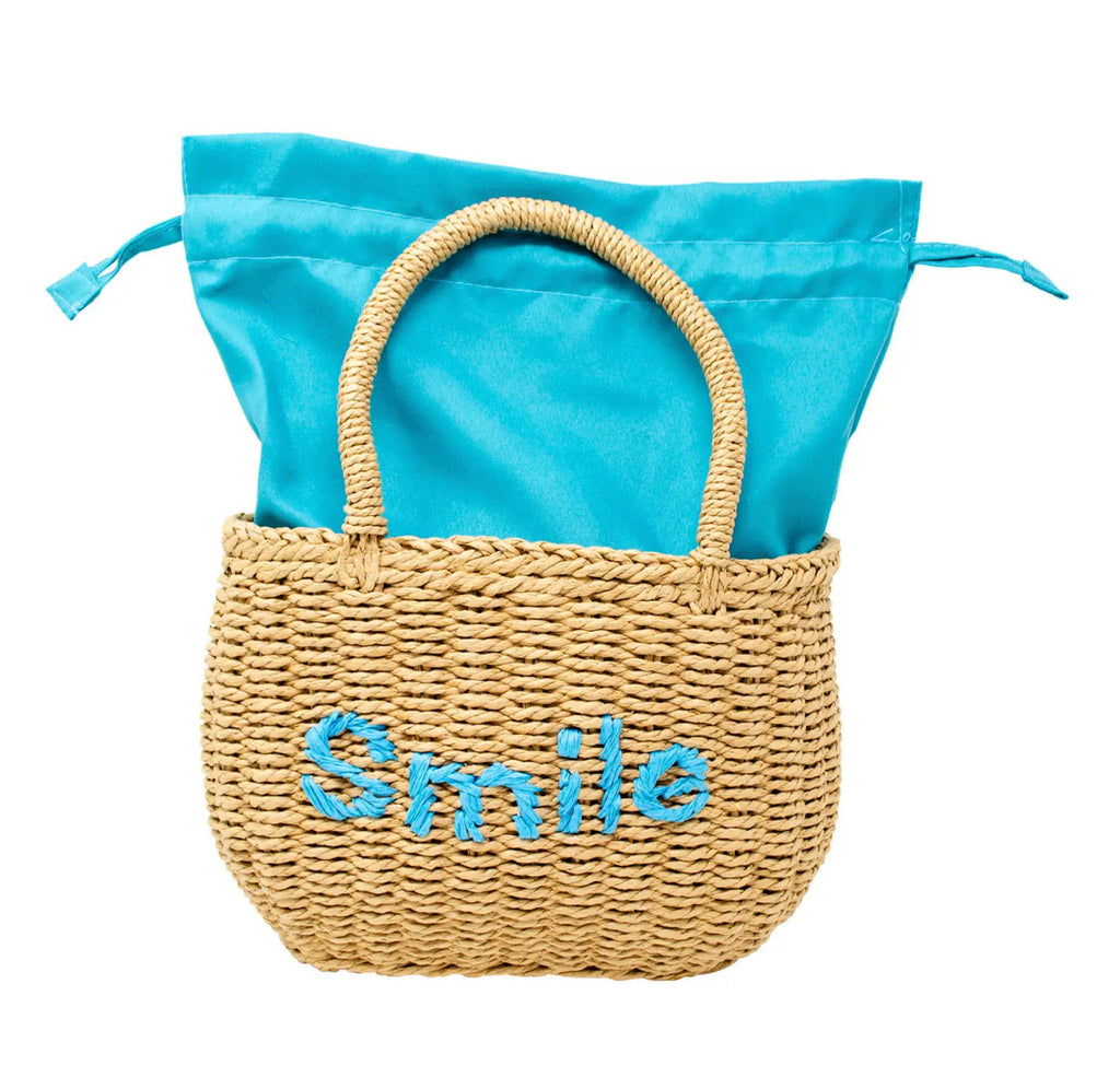 This stylish wicker basket bag is super versatile and can be used as a handbag or a picnic basket. The inside of this bag is lined with cloth matching the "Smile" print on the outside and has drawstrings to close tight. Measures: 11 x 5 x 12 inches.