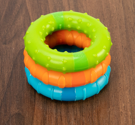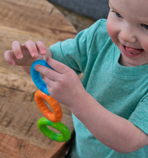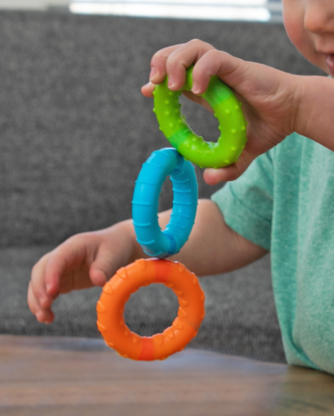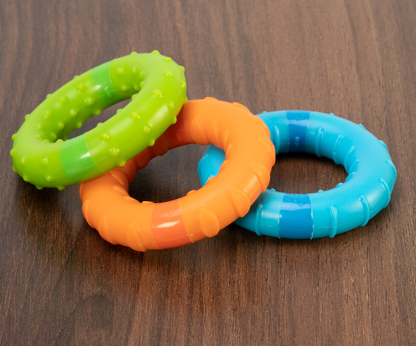 Each ring is covered in a soft, rubbery material, features unique textures for the fingers to explore, and has a built-in rattle that delights the ears.
