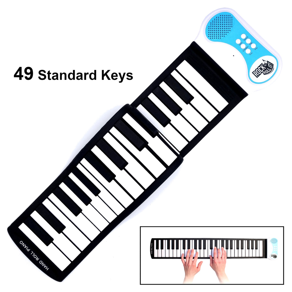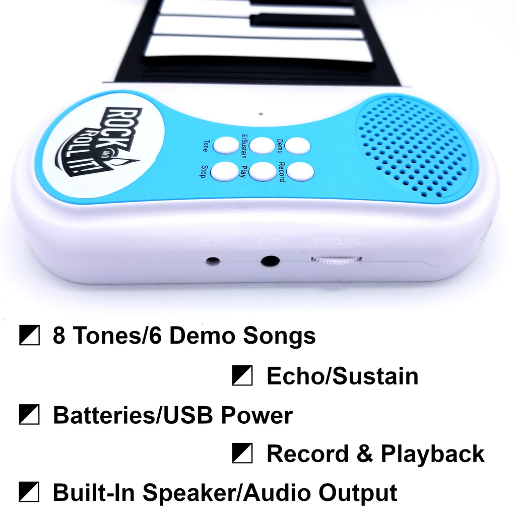 - MULTIFUNCTIONAL KEYBOARD FOR EVERYONE: Features multiple keyboard tones and demo songs, record & playback, echo/sustain, built-in speaker with volume control, and audio output. Perfect for everyone from beginner to master, children to adults - rock out then roll it up!