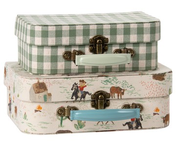 A perfect suitcase set to store all your favorite items. Each suitcase is covered by unique Maileg fabrics and has colored metal handles. This 2 pcs set is perfect both for storage and for carrying your favorite toys in.