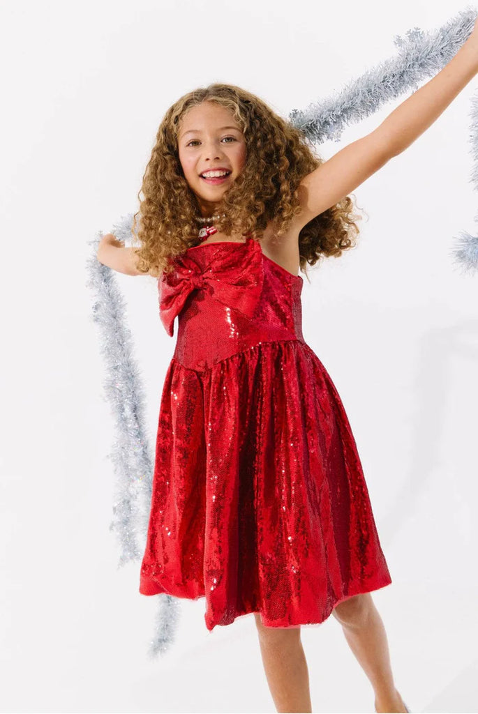 - Stunning red sequin dress with a statement oversized bow detail on the front