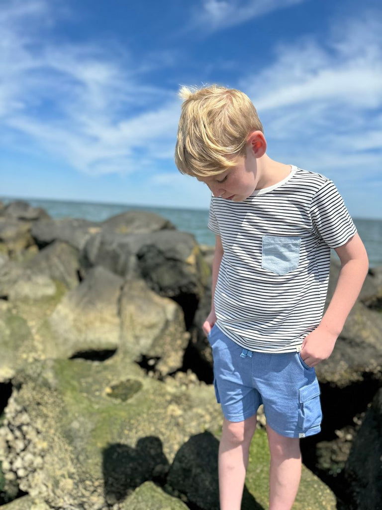 This soft cotton tee has a contrast functional pocket on the left. Contrasting piping around the collar adds interest to this tee.