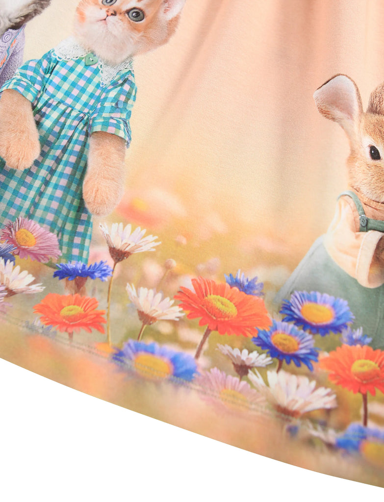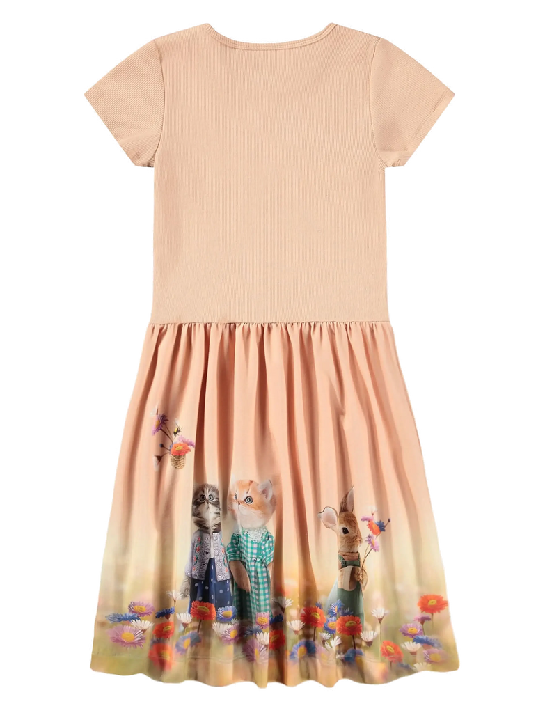 This short-sleeved dress from Molo is made of organic cotton with a fitted ribbed jersey top and smooth jersey skirt. The skirt of the dress features a print of adorable animals dressed in clothes and beautiful flowers.