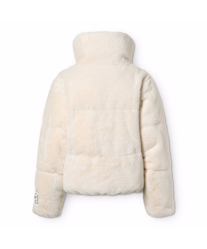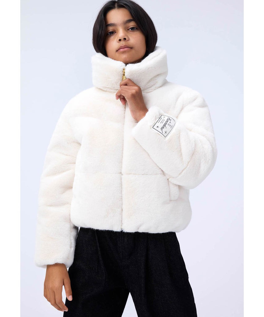 Off white jacket in soft, imitation fur made of recycled polyester. The jacket has a stand-up collar, side pockets, and elastic around the wrists and at the bottom. The jacket has a beige lining and is padded with recycled polyester filling, providing even softness and optimal warmth insulation.