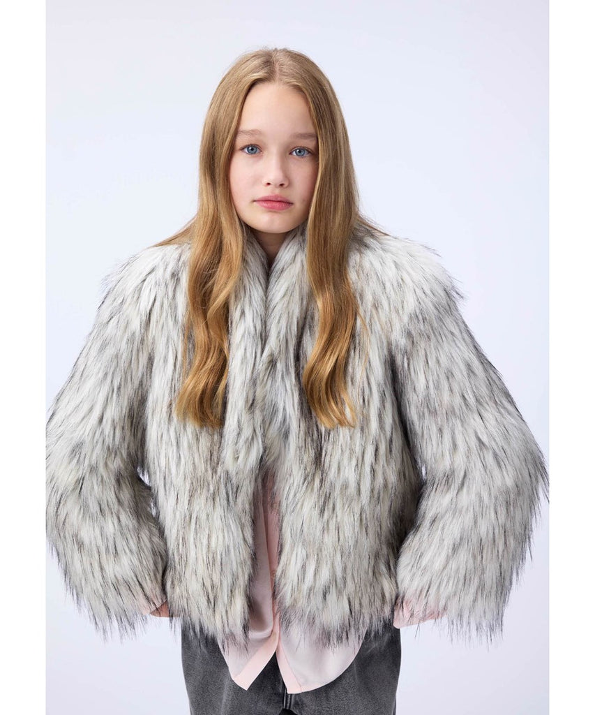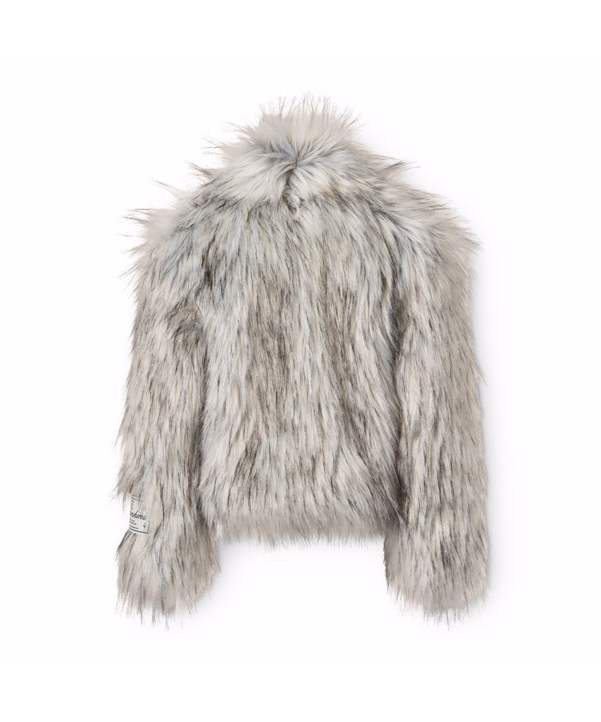 Faux fur jacket in grey and black colours with a high collar. The jacket has a regular fit, is hip-length, and fastens with a large clasp.