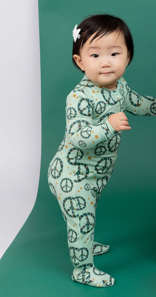 The softest bamboo pajamas in our Peace and Joy print This adorable piece is ready for some Winter and Holiday fun. Grab this up and add to your kids Christmas clothes wardrobe.