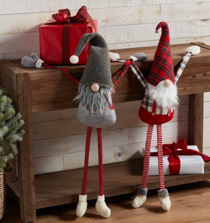 Hang with your gnomies this holiday season with our tartan large dangle arm gnome. The wool, felt and knit gnome has weighted mittens that allow for gnome to hang from furniture. In order for the gnome to hang properly, we recommend tilting the head back and supporting the gnome with a wall behind it.