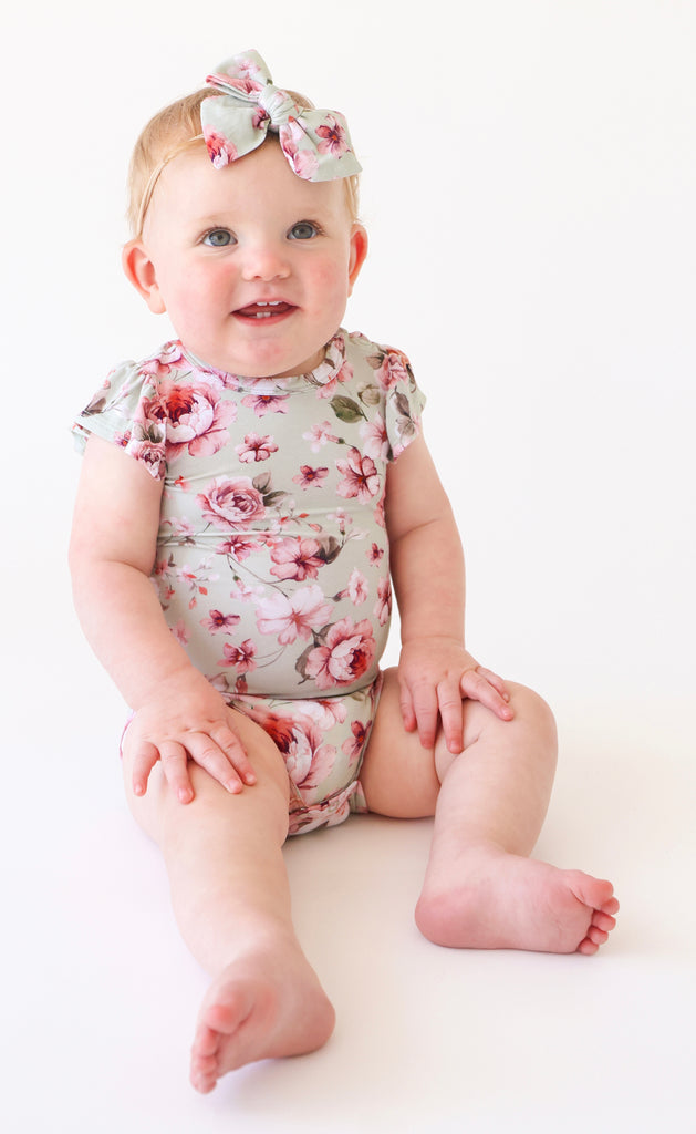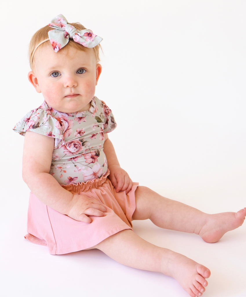 Signature ruffled cap sleeve bodysuits in beautiful designs are a staple piece to mix and match with. 3-button closure for easy diaper change, breathable, lightweight, and stylish. Mix and match our luxe viscose from bamboo bodysuits with your favorite jeans, shorties, and much more!