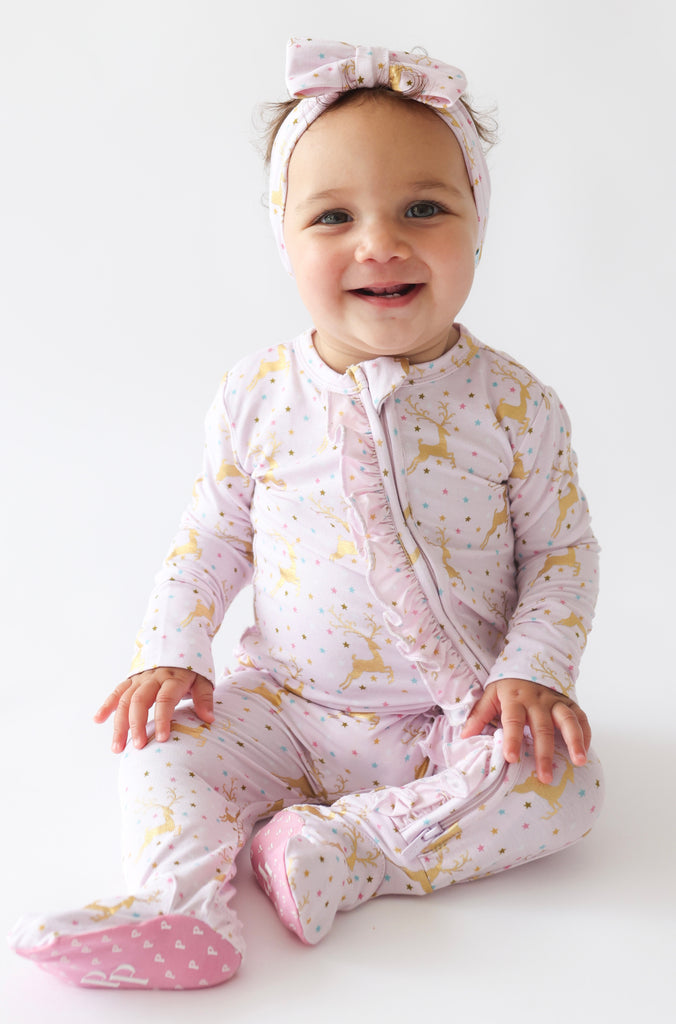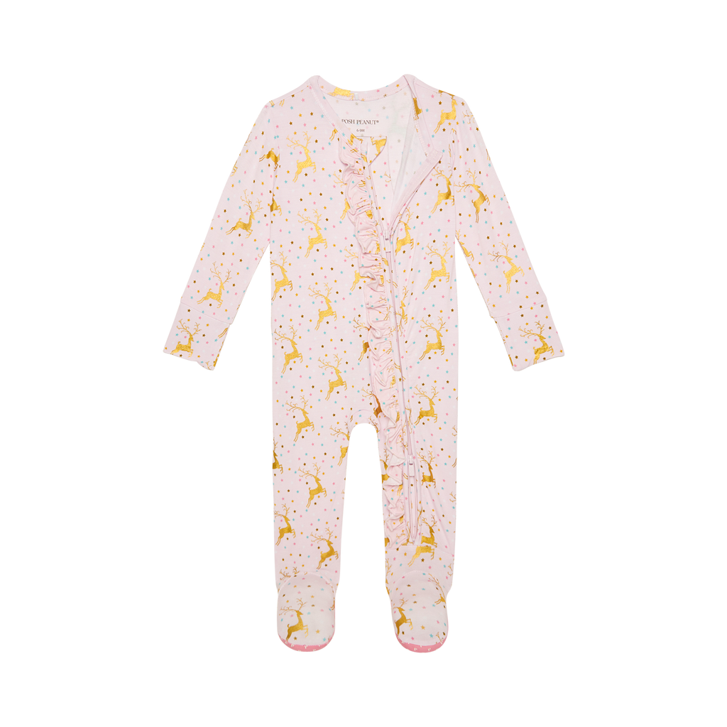This footie ruffled zippered one piece is what PJ dreams are made of. Designed with our ultra-soft Päpook® viscose from bamboo, these jammies feature 2-way zippers that make quick changes a breeze! Available in coveted prints and outfitted with signature Posh Peanut® footie grips, elastic backing on footies for a snug fit, and fold-over mittens in sizes NB and 0-3M, this one piece is guaranteed to be a daily go-to.