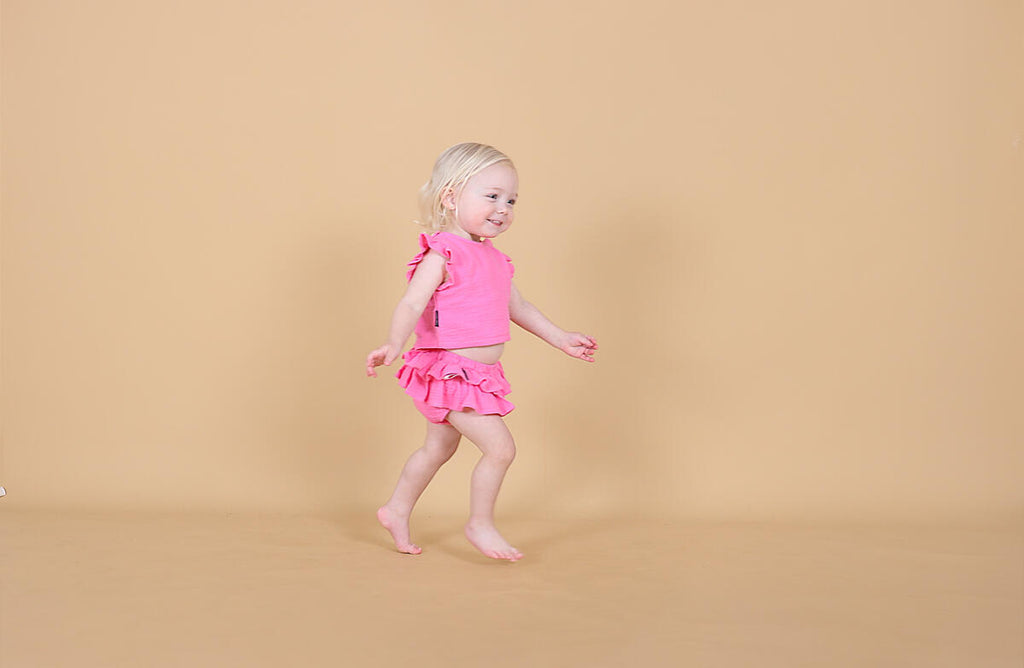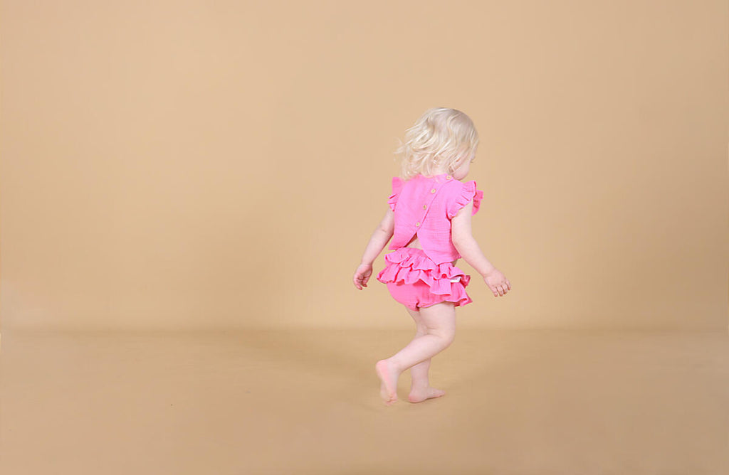 This Hot Pink Linen Ruffle Set features a matching top and bottom with both pieces having a woven texture all over and frill detailing. Crafted from Linen, the composition provides comfort and durability. Finished neck, sleeve and hem detail. Designed in Australia.