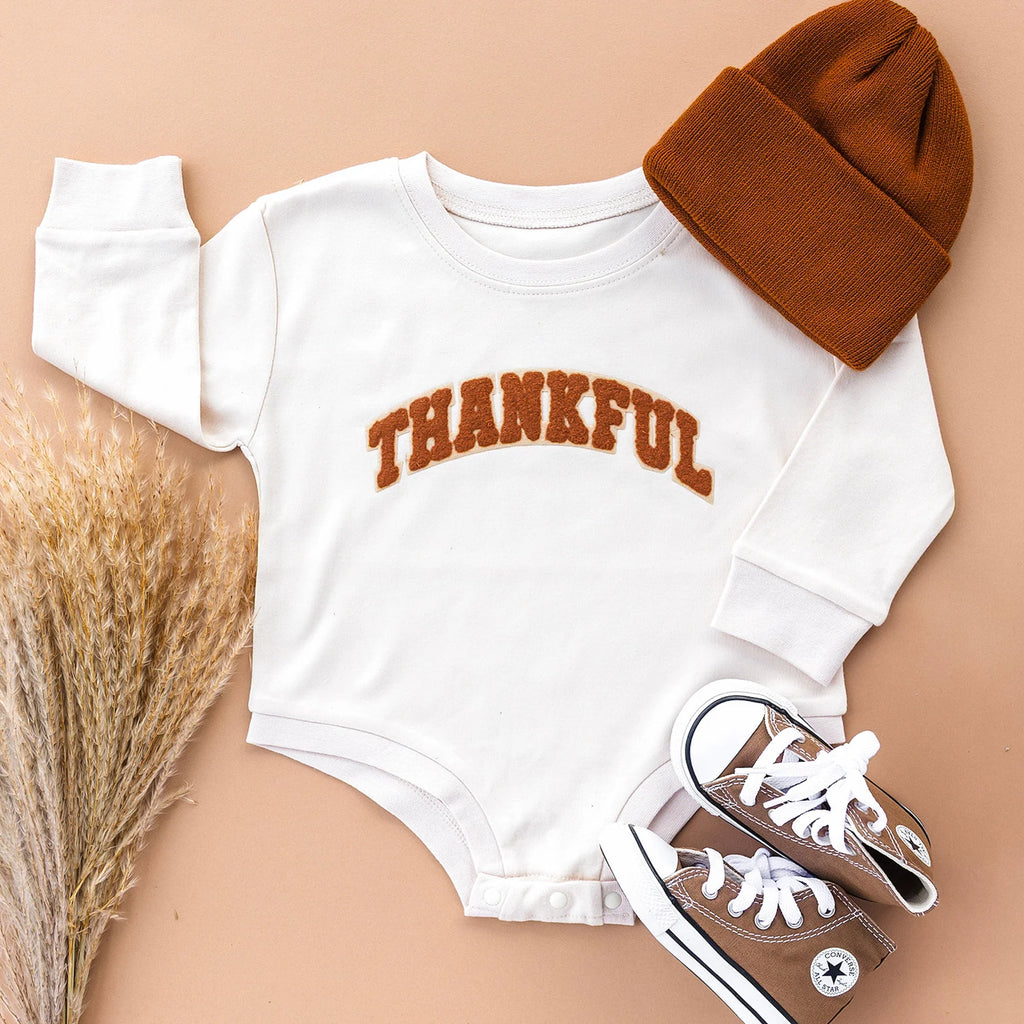 Thankful Patch Varsity Thanksgiving Long Sleeve Romper