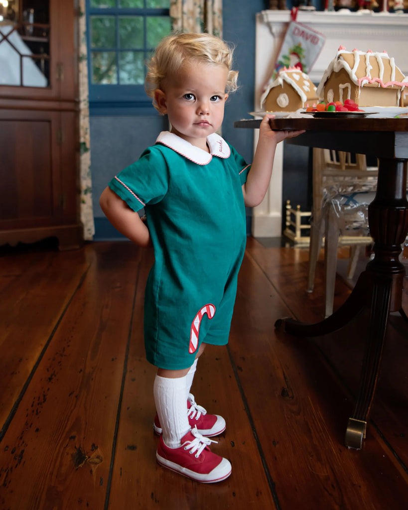 Stroll down candy cane lane in the sweetest candy can applique corduroy shortall. Rounded peter pan collard and metal snaps in stride—the perfect holiday outfit for school or family time. Add a name or monogram for a personal touch.