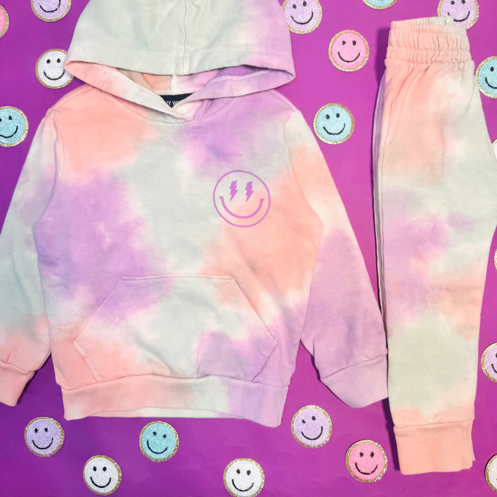 This Tiny Whales sweatshirt will make your kids' casual wardrobe come alive with color. Soft and stylish, the trendy tie dye pattern pairs perfectly with the smiley face graphic on the front. Classic details like ribbed cuffs and a front kangaroo pocket make it a must-have.