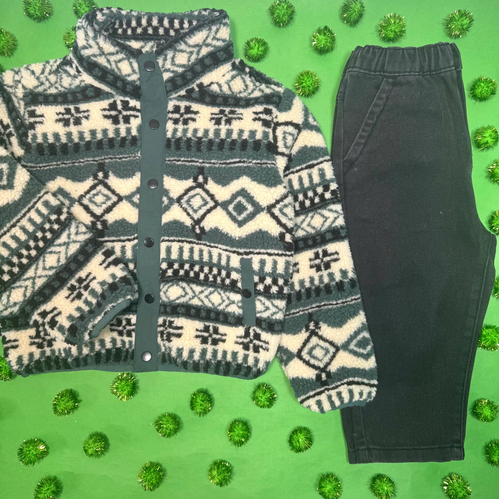 Autumn adventures will be even better when he has on this cozy Tiny Whales jacket. Patterned sherpa fabric and contrast trim give it a timeless look that will never go out of style. A stand collar and snap front closure will keep him plenty warm, while snap hand pockets make it perfect for storing tiny treasures.