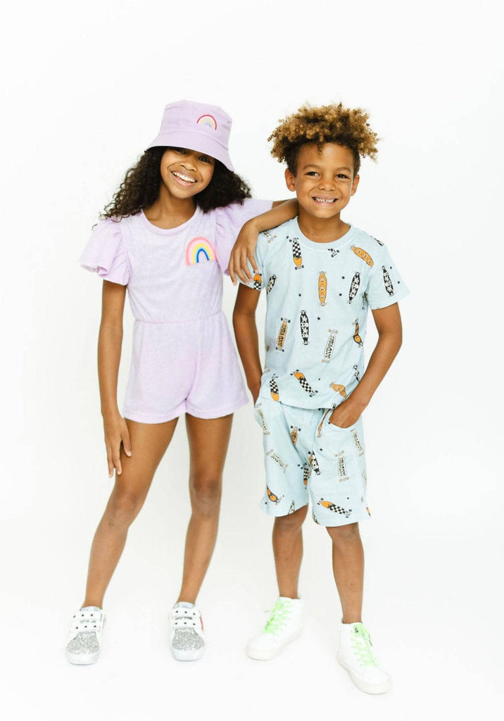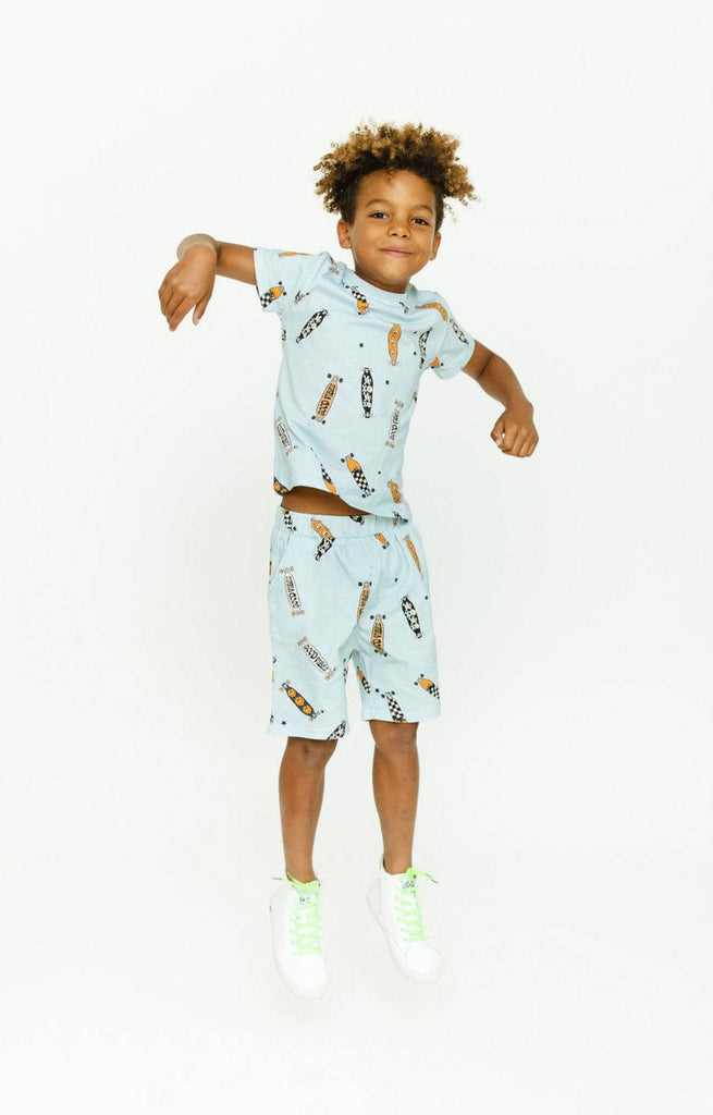 - Hit the streets in style with this setfeaturing a playful all-over skateboard print.