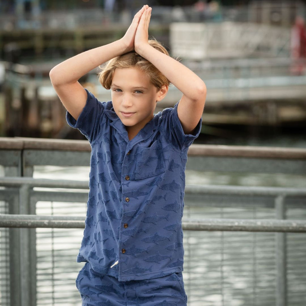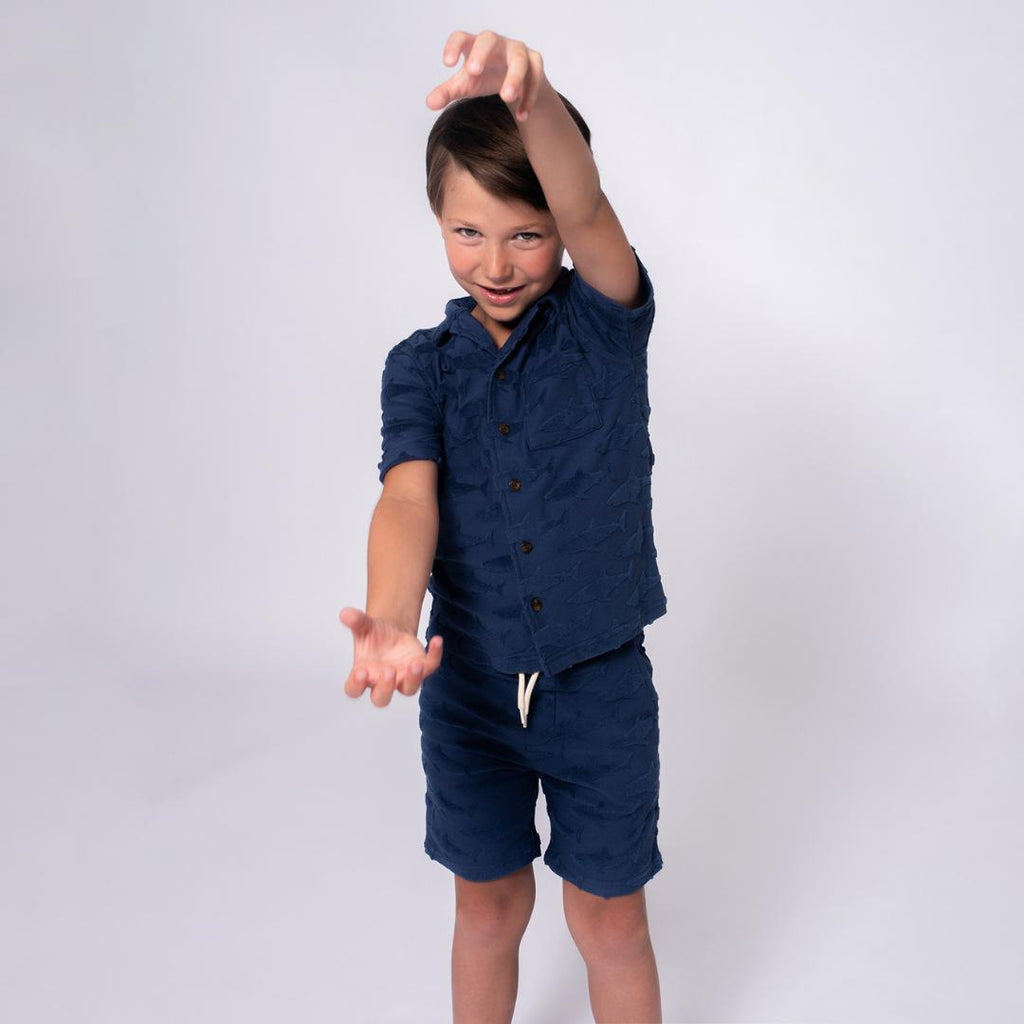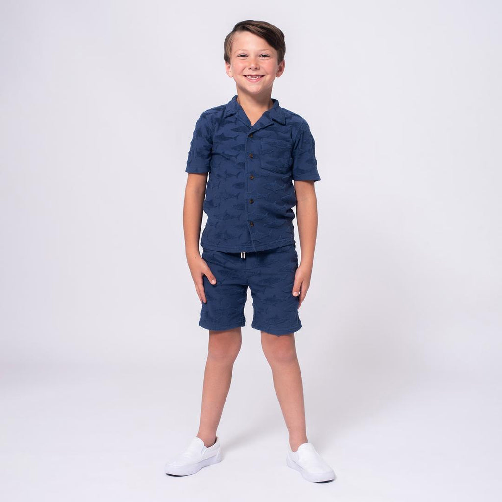 Get ready for jawsome style with our boys' resort shirt featuring an all-over shark print! Made from lightweight, breathable fabric, this shirt is perfect for beach days or casual outings. With its fun design and easy, relaxed fit, it’s versatile enough for vacations or everyday adventures. Let him dive into cool, ocean-inspired style! Pair with the Resort Shorts in Navy Blue to complete the matching set!