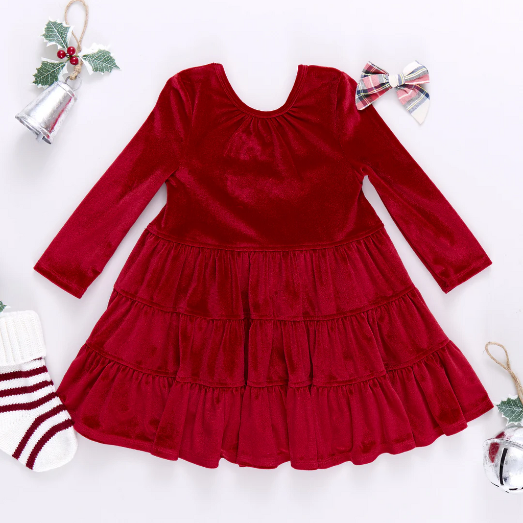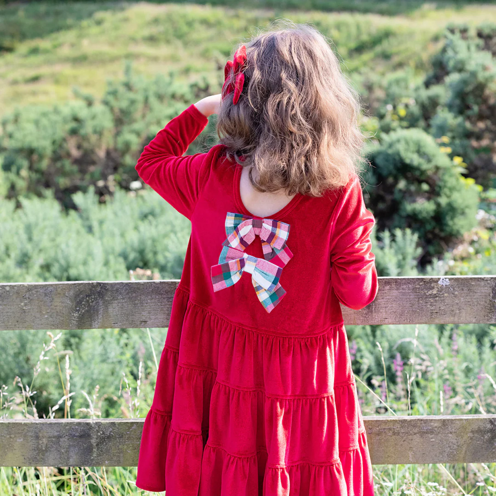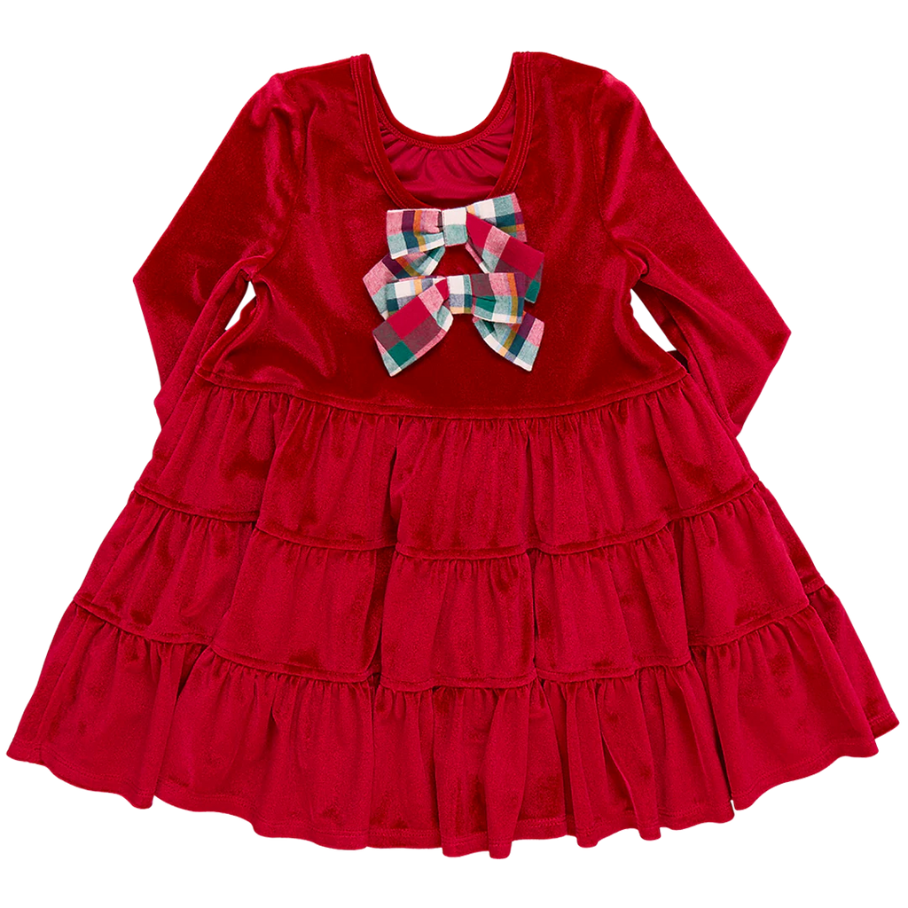 Christmas Chic! Our classic Girls Pearl Dress makes a stylish holiday statement fashioned in a rich Red Velour. The three tiered, long sleeve crewneck silhouette dips lower in the back highlighting two festive tartan bows.