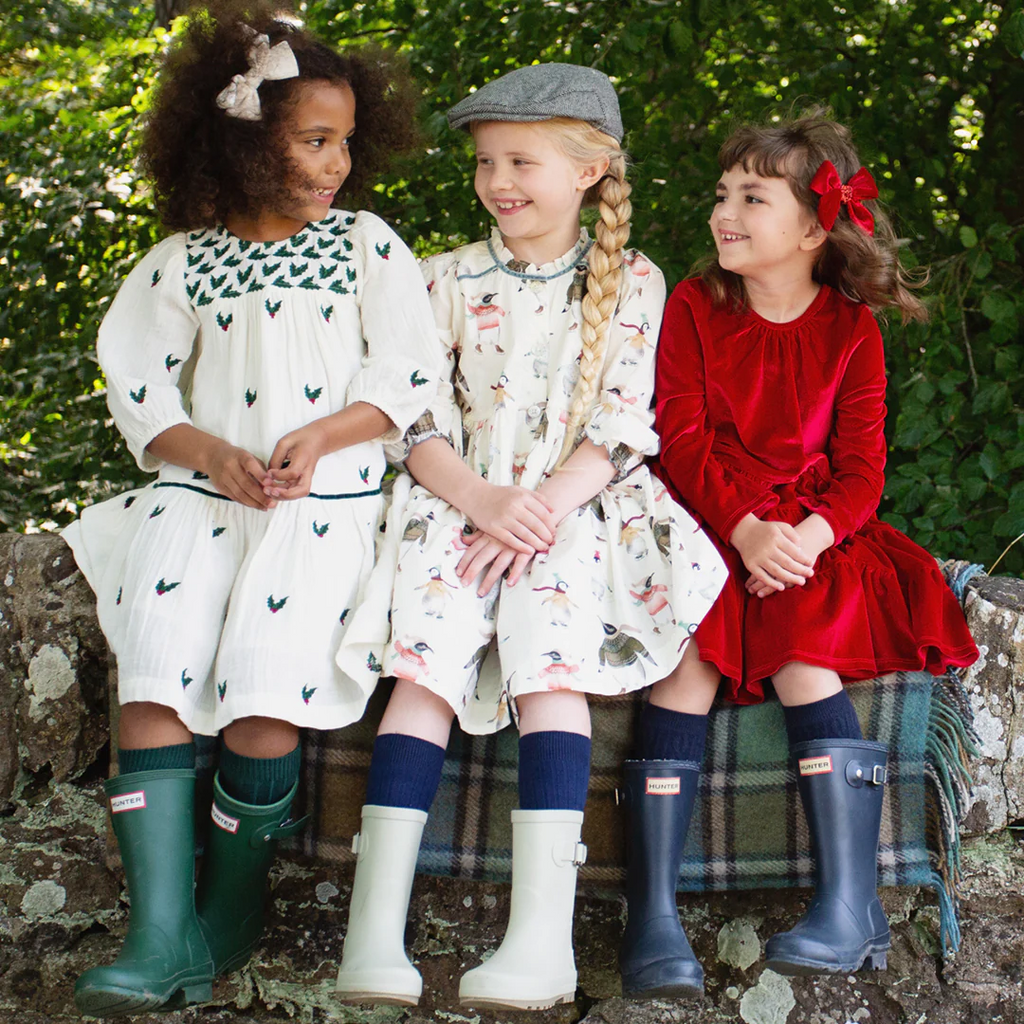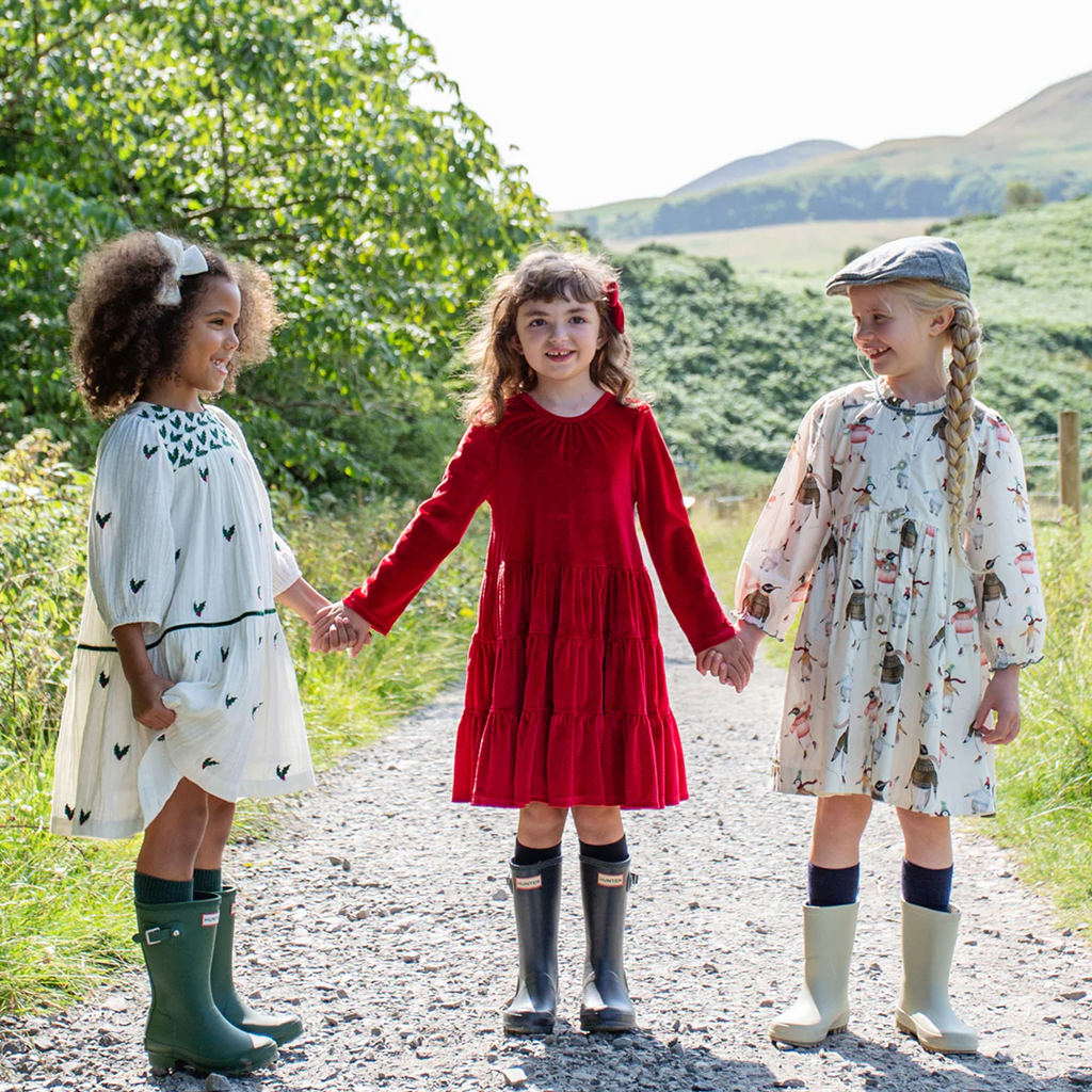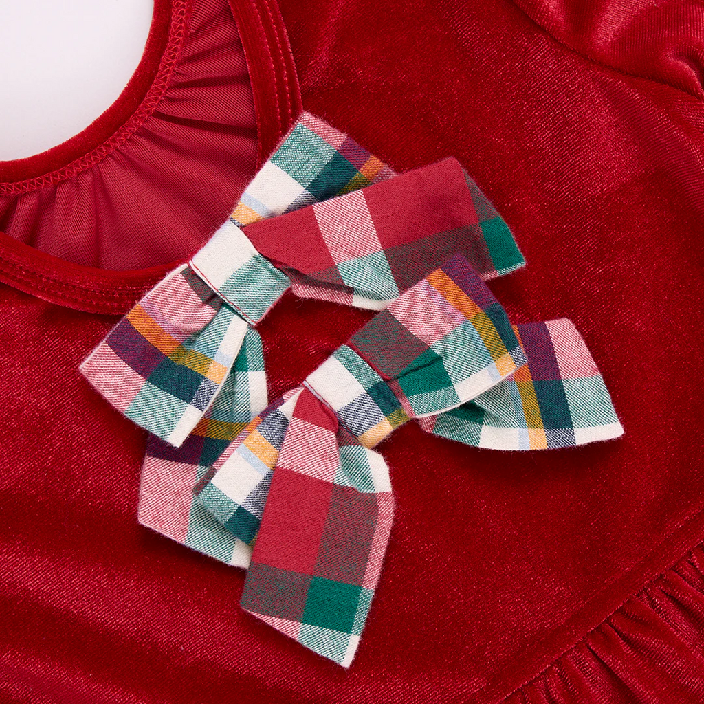 Christmas Chic! Our classic Girls Pearl Dress makes a stylish holiday statement fashioned in a rich Red Velour. The three tiered, long sleeve crewneck silhouette dips lower in the back highlighting two festive tartan bows.