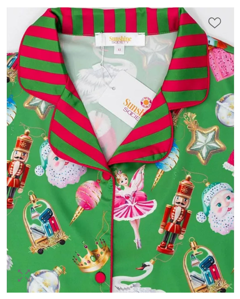 Crafted from a lightweight, silky-soft fabric that feels luxurious against the skin, this festive set features whimsical Christmas icons — think Nutcrackers, ballerinas, Santa faces, and shimmering ornaments — all dancing across a vivid green backdrop trimmed with candy cane stripes.