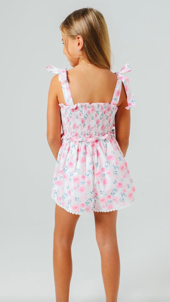 The Shellona romper is made from soft cotton fabric, designed with a shirred chest to provide a comfortable and flattering fit. It also features self-tie shoulder straps that allow for easy adjustment and a fun lace embellishment at the legs.