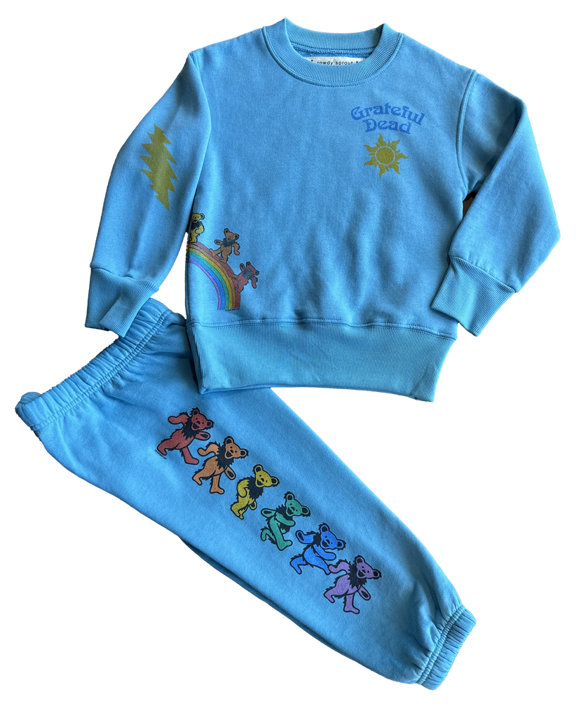 Bright, bold, and born to boogie. The Rowdy Sprout Grateful Dead Rainbow Bears Crewneck wraps your little one in cozy comfort and psychedelic charm.