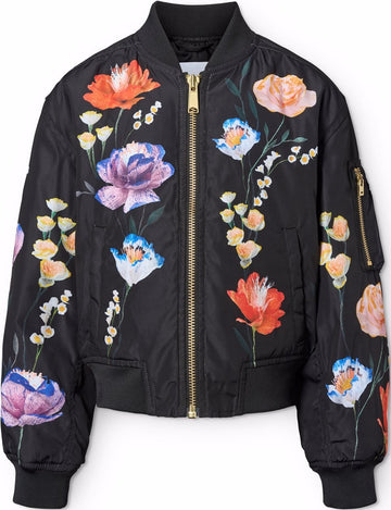 Black bomber jacket with a colourful floral print made from recycled polyester. The bomber jacket has a regular fit, front pockets, a zip pocket on the sleeve, practical zip closure with wind flap, and ribbed edges at the neck, cuffs, and hem. Furthermore, the jacket has a recycled polyester filling that provides smooth softness and optimal thermal insulation, and the water-repellent surface is free from PFOS and PFOA.