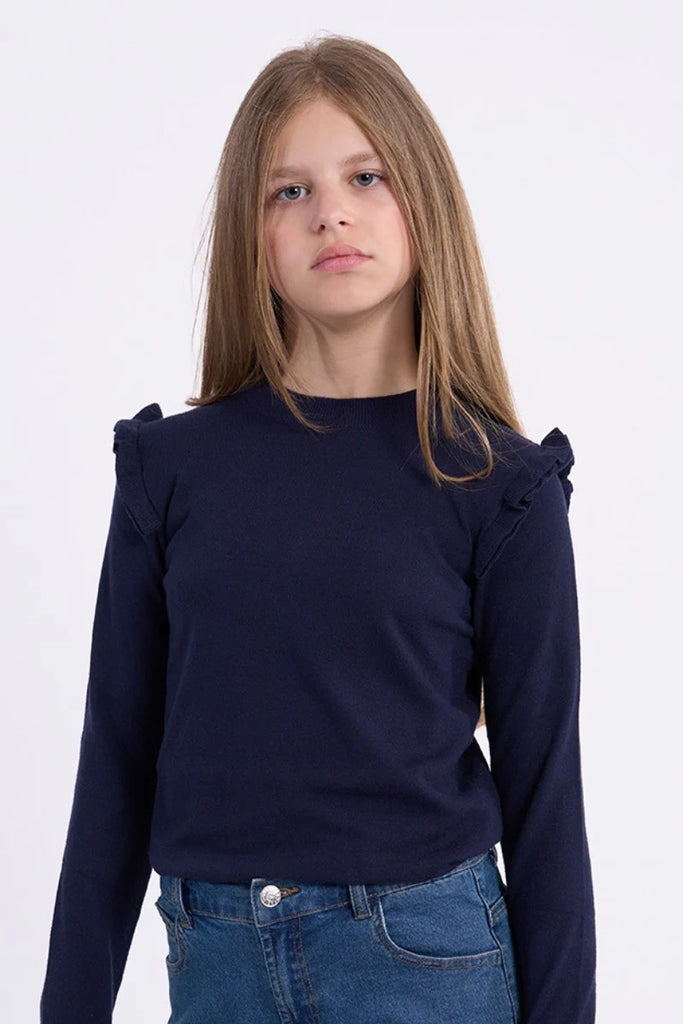 This navy girls' sweater combines cozy warmth with charming details. Its fine knit and slim fit gently hug her frame, while the semi-high neckline adds a touch of elegance. Long sleeves end in wide, tightened cuffs for a playful twist, and ruffled bands on the shoulders bring extra fun flair to every move. Crafted from a soft blend of viscose, polyester, and polyamide, it’s perfect for day-to-day adventures with a stylish edge.