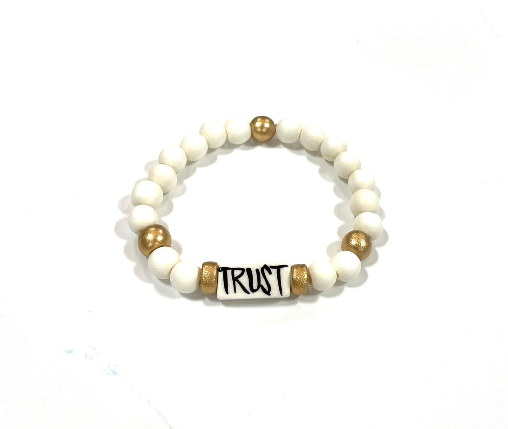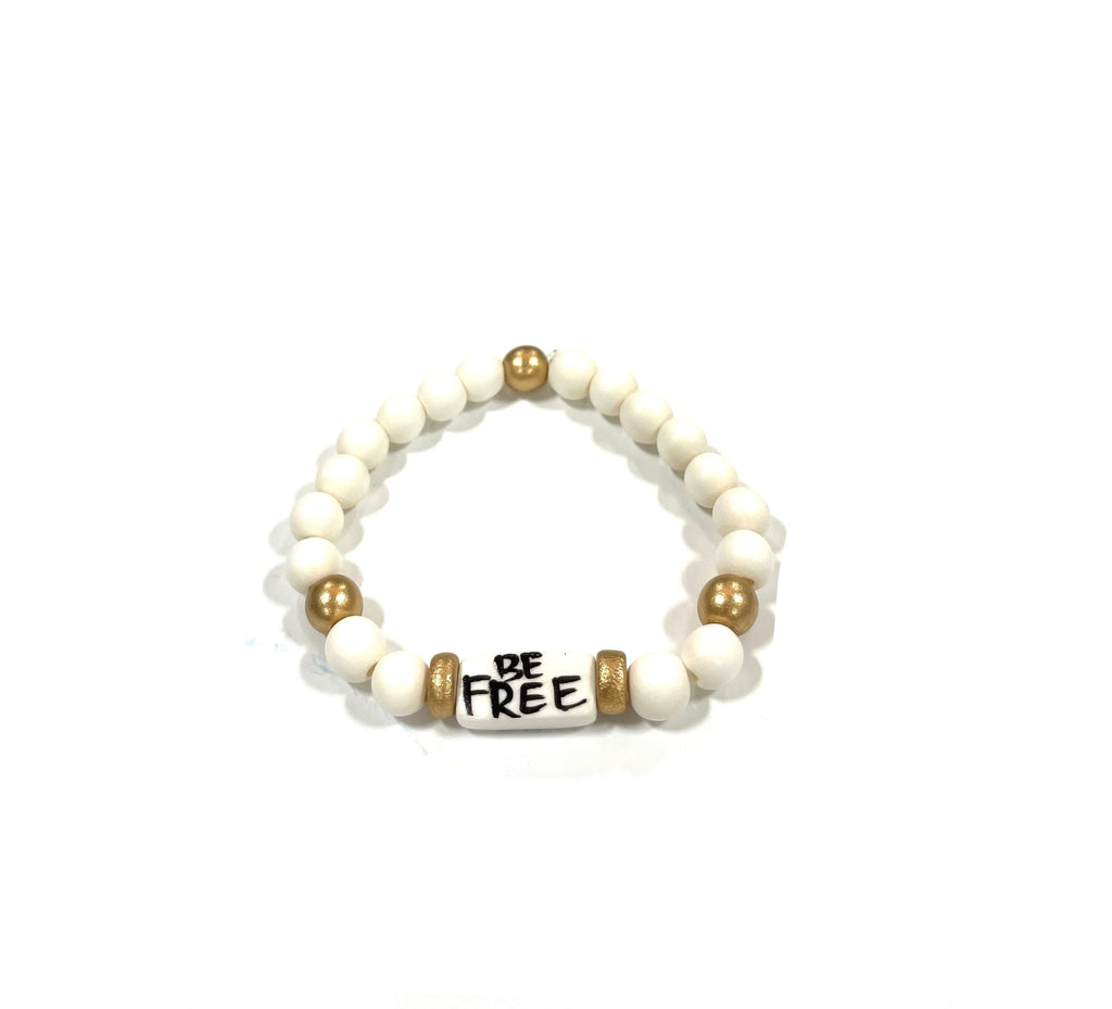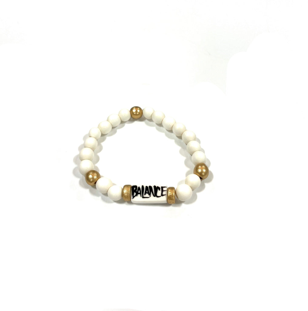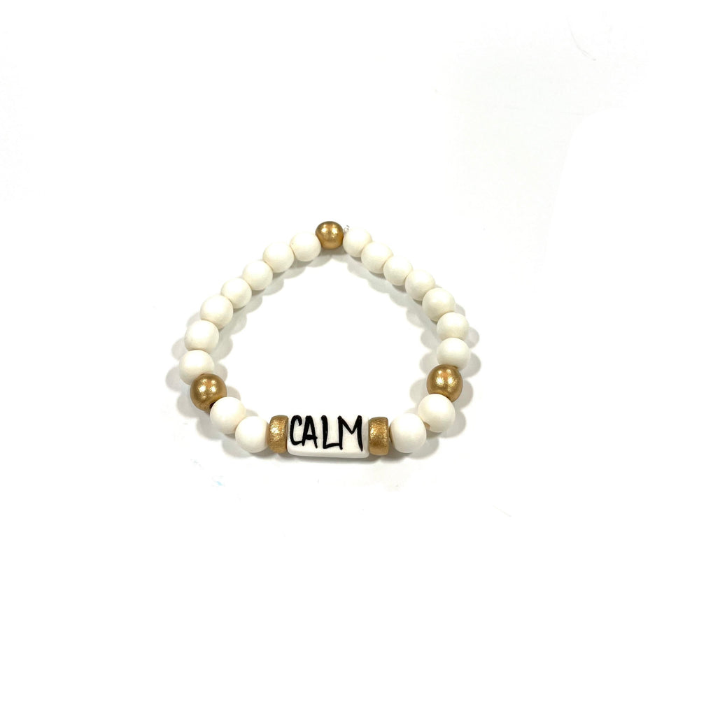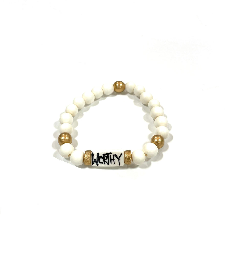 Affirmation bracelet featuring a hand-painted lettered focal bead by Audra and our abstract print beads. Stretchy to fit most wrists.