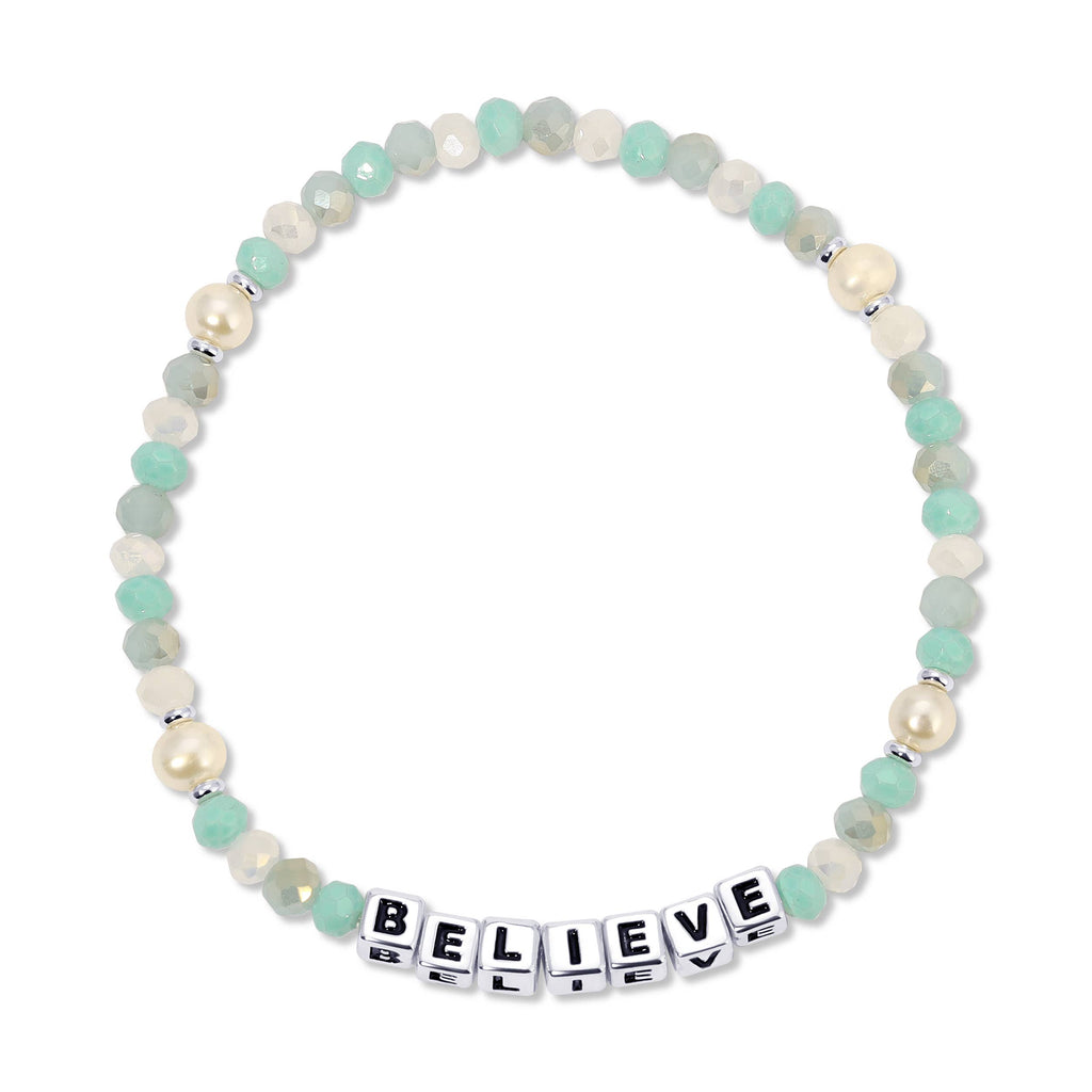Believe - Seaside Mist crystal & Pearl / Sterling Silver plated accents on a stretch cord.
