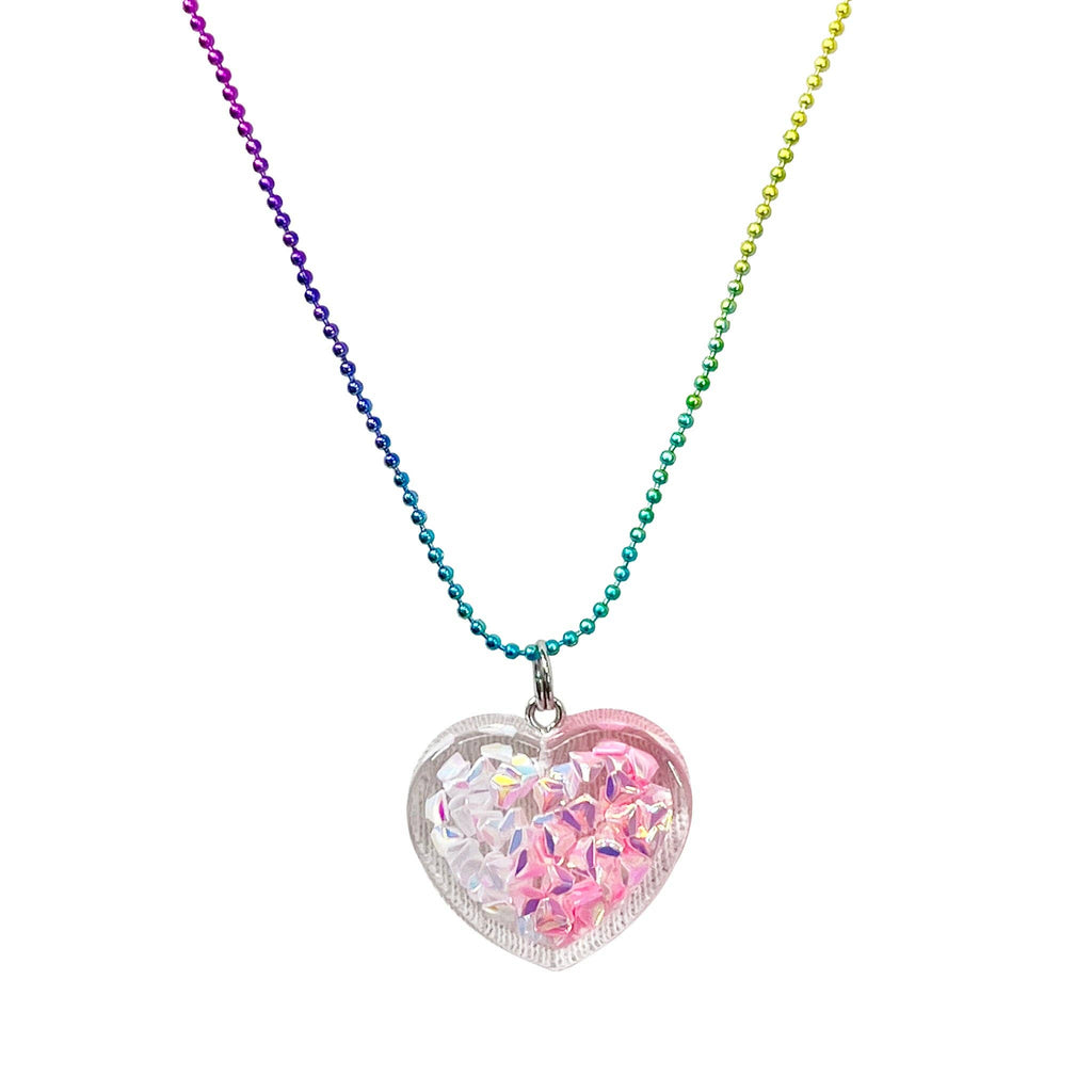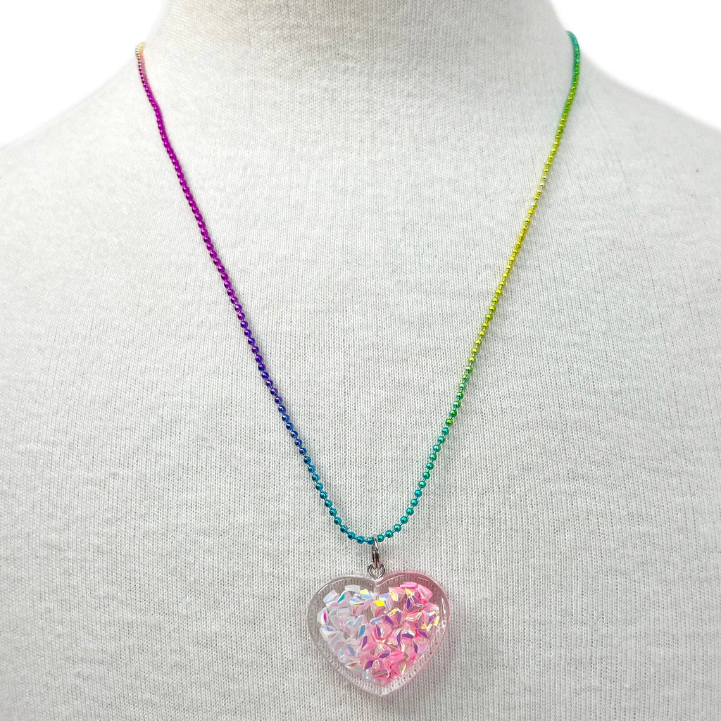 Behold the enchanting Mermaid Heart Necklace! This charming piece showcases a heart shaped resin pendant holding shimmering glitter shapes in soft pink and dazzling white. Its rainbow necklace, an exquisite addition, extends the colour palette! Plus, the adjustable clasp closure ensures a perfect fit for all!