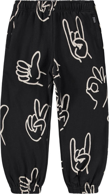 Black sweatpants made of organic cotton with an elastic waist, inner drawstring, elastic around the ankles and side pockets. The sweatpants have a regular fit and a white print of various hand signs.